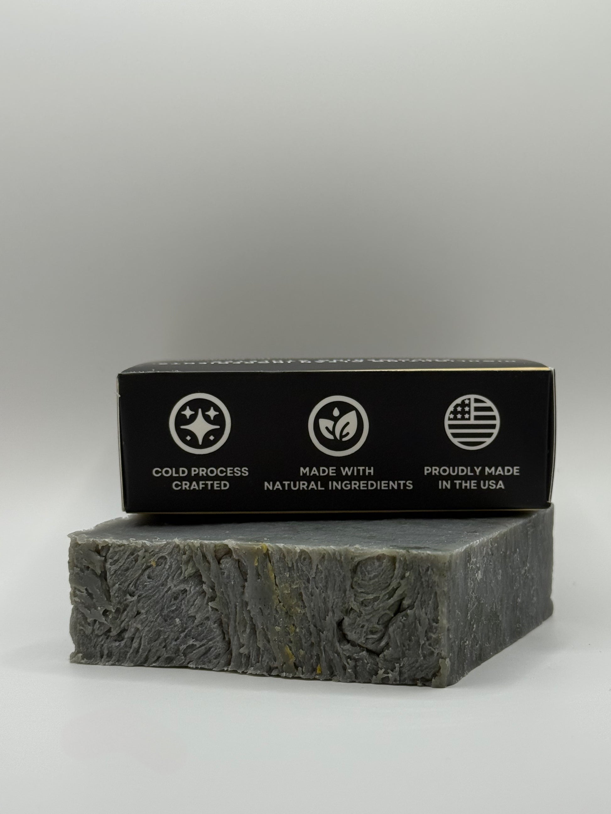 Ingredients: Saponified Oils (Olive Oil, Organic Palm Oil, Organic Coconut Oil, Organic Shea Butter), Fragrance, Bentonite Clay, Green Clay, Spirulina Powder, Black Walnut Hull, Aspen Bark Extract, Chromium Oxide, Black Oxide.